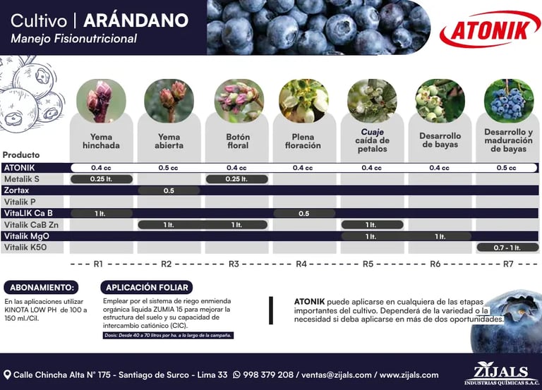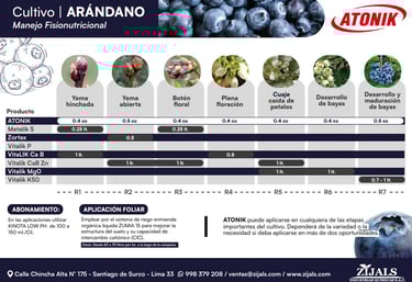 El presente programa de Nutricion Fisiologico ha sido desarrollado por el equipo técnico de Zijals Industrias Quimicas S.A.C, con el objetivo de potenciar al máximo el rendimiento de los campos de arándanos mediante un manejo óptimo de los niveles de fertilización . Esta propuesta nutricional busca garantizar un equilibrio adecuado de nutrientes a lo largo del ciclo del cultivo, promoviendo una planta vigorosa, una floracion uniforme y una produccion de alta calidad.