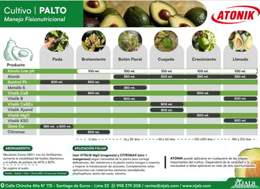 El presente programa de Nutricion Fisiologico ha sido desarrollado por el equipo técnico de Zijals Industrias Quimicas S.A.C, con el objetivo de potenciar al máximo el rendimiento de los campos de palto mediante un manejo óptimo de los niveles de fertilización . Esta propuesta nutricional busca garantizar un equilibrio adecuado de nutrientes a lo largo del ciclo del cultivo, promoviendo una planta vigorosa, una floracion uniforme y una produccion de alta calidad.