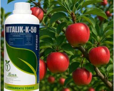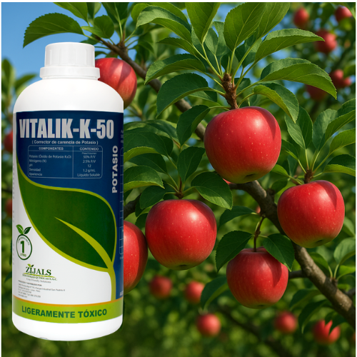 Es un corrector de carencias de potasio en forma líquida. Totalmente exento de cloruros, es de fácil asimilación y su aplicación mejora el cambio de color en los frutos.