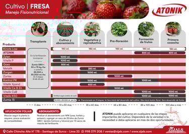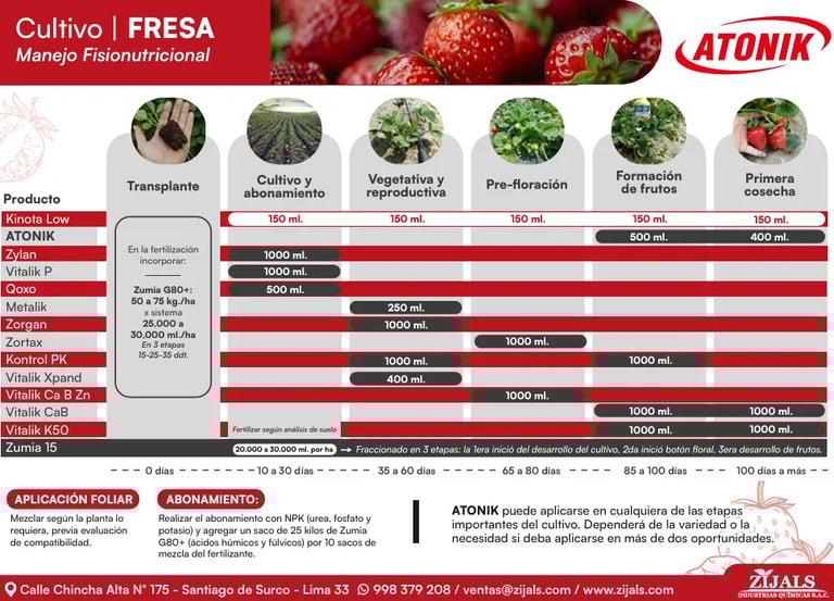 El presente programa de Nutrición Fisiológico ha sido desarrollado por el equipo técnico de Zijals Industrias Químicas S.A.C, con el objetivo de potenciar al máximo el rendimiento de los campos de fresas mediante un manejo óptimo de los niveles de fertilización. Esta propuesta nutricional busca garantizar un equilibrio adecuado de nutrientes a lo largo del ciclo del cultivo, promoviendo una planta vigorosa, una floración uniforme y una producción de alta calidad.