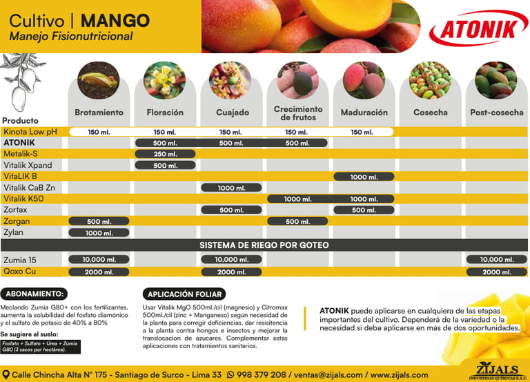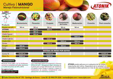 El presente programa de Nutrición Fisiológico ha sido desarrollado por el equipo técnico de Zijals Industrias Químicas S.A.C, con el objetivo de potenciar al máximo el rendimiento de los campos de mangos mediante un manejo óptimo de los niveles de fertilización. Esta propuesta nutricional busca garantizar un equilibrio adecuado de nutrientes a lo largo del ciclo del cultivo, promoviendo una planta vigorosa, una floración uniforme y una producción de alta calidad.
