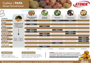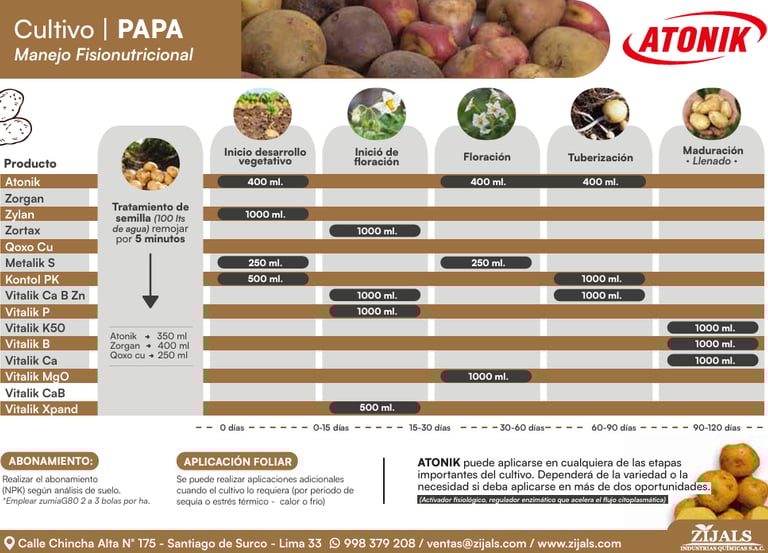 El presente programa de Nutrición Fisiológico ha sido desarrollado por el equipo técnico de Zijals Industrias Químicas S.A.C, con el objetivo de potenciar al máximo el rendimiento de los campos de papas mediante un manejo óptimo de los niveles de fertilización. Esta propuesta nutricional busca garantizar un equilibrio adecuado de nutrientes a lo largo del ciclo del cultivo, promoviendo una planta vigorosa, una floración uniforme y una producción de alta calidad.